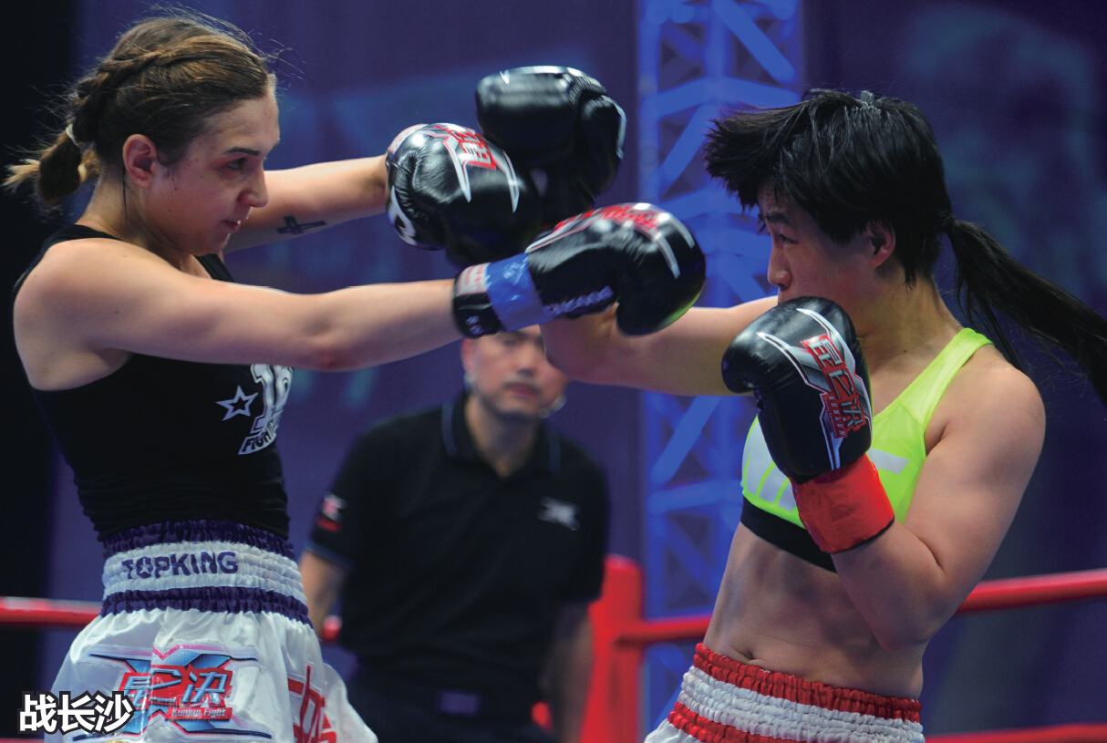 中国最具人气的搏击赛《昆仑决》踏上另一座城池——“楚汉名城”长沙。一场世界自由搏击王者聚首的“昆仑决·战长沙”于4月26日在湖南涉外经济学院体育馆开战。来自中国的自由搏击选手王赛、努尔拉、阿斯哈提等,与来自美国、俄罗斯、泰国等国的28名高手展开激烈角逐,为武迷们带来难得一见的震撼擂台表现。图为中国“散打一姐”鄂美蝶(右)与俄罗斯女拳手瓦勒丽雅·德洛佐娃在比赛中。
