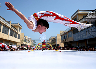 “五一”假期,各地旅游景点人满为患,各种表演层出不穷。5月3日,安徽亳州,谯城区十河镇生态旅游节开幕,6岁男孩李正阳表演柔术。观众纷纷惊呼:“这么小的孩子怎么受得了?”