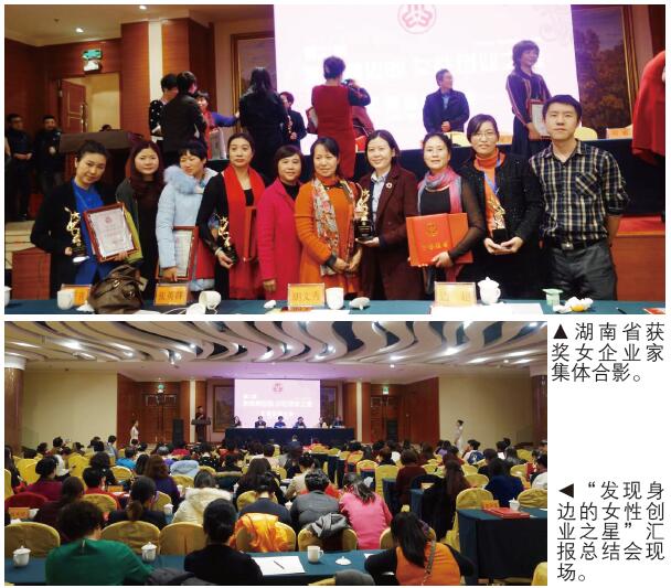 全国妇联于今年4月份开始筹备第二届“发现身边的女性创业之星”活动,从全国各地妇联组织推荐的650多名女性企业家中,评选了104名“女性创业之星”。我省共有11名女企业家得此殊荣,涉及环保、日化、医药、轻纺、机械、养殖、饮用水等多个行业,获奖人数位居全国同行之首,获奖代表分别是长沙华时捷环保科技发展有限公司副总经理蒋晓云、长沙普济生物科技有限公司总经理李今微、湖南浏阳市兴乐种植科技开发有限公司董事长周慈英、湖南昌盛鸿源农业科技有限公司董事长黄红霞、洞口县熙怡茧丝绸有限公司董事长邓圆、平江阳光国际集团董事长叶琳、娄底市乐开口实业有限公司董事长程红梅、麻阳霞飞农业开发有限公司董事长谭霞、龙山县恒龙中药业拓展有限公司董事长邓娜、湖南省古丈县友谊农业综合开发有限公司法人兼总经理李永花。