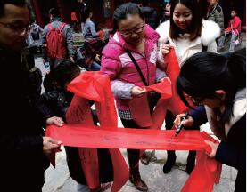 元旦佳节,在世界自然遗产地湖南张家界宝峰湖风景区,上千名游客在“祝福墙”上写下新年的祝愿,并把留有自已心愿的红丝带系在景区的祝福桥上祈福迎新,在寓意着爱的“醉美情湖”,展示出对祖国、对家庭新春美好愿望的守护。