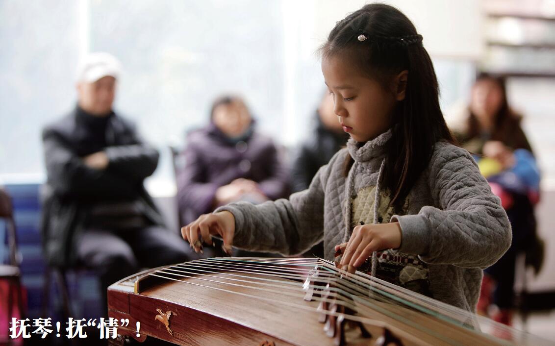 子冲社区孤寡、空巢、特困老人家中,开展为老人“喝一首新年歌曲、送一幅迎春对联”寒假志愿服务活动。图片为二年级学生刘晓演奏古筝《浏阳河》。