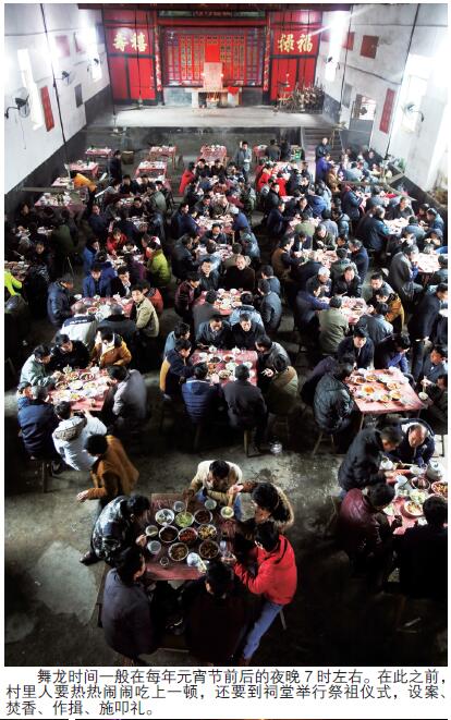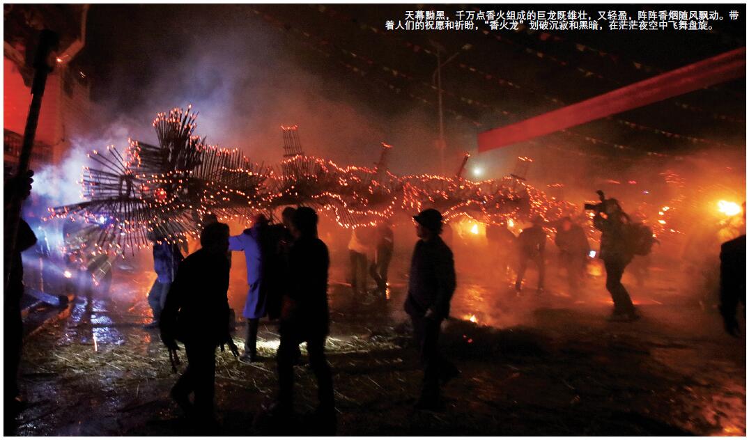 在龙珠转动的指引下,“香火龙”行走在田间,倒影越过水面,星光熠熠,把整个村庄绕圈一周。最后,“香火龙”带着新一年风调雨顺、五谷丰登的美好希望回到祠堂,男女老少开始了新春最后一天的大狂欢。