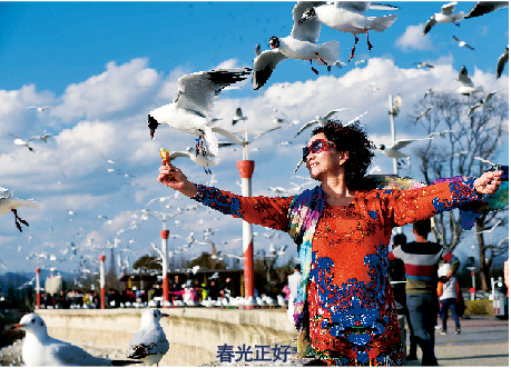 三月三日气象新,长安水边多丽人。杜甫用华美的诗句向我们展示了古代人春游的场景。在古代,富人春游,均是鲜衣怒马,华盖相随。而今,阳春三月,冰雪消融,万物复苏,一年一度的春游季又在召唤我们。图为 3月1日,云南昆明,阳光明媚,众多市民游客来到昆明海埂大坝赏鸥喂鸥。