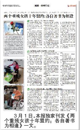3月1日,今日女报/凤网独家刊发《两个重残女孩十年盟约:各自著书为相逢》一文,讲述了湖南、广西两个从未上过学的重度残疾女孩,为了能够在现实生活中见一面,相约写书,并约定两人相逢的时间和地点在新书发布会的故事。报道刊发后,两个轮椅女孩的励志故事感染了很多人,也牵动了很多人的心。