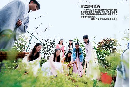 3月16日,湖南中医药大学的学生开始了新学期首堂室外实践课。学生们身着汉服来到校内的药植园学习种植中草药,以此方式弘扬千年中医药文化。