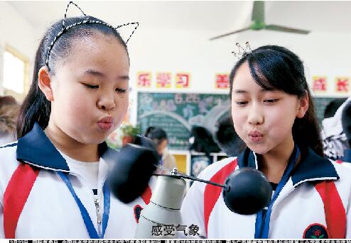 3月23日,国际气象日,全国许多学校组织学生们学习气象科普知识,提高应对自然灾害的能力。图为广西柳州市融安县长安镇第三小学两名学生在体验风速传感器。据悉,今年3月23日是第56个世界气象日,今年世界气象日的主题是“直面更热、更旱、更涝的未来”。(详见B04版) 摄影/ 谭凯兴