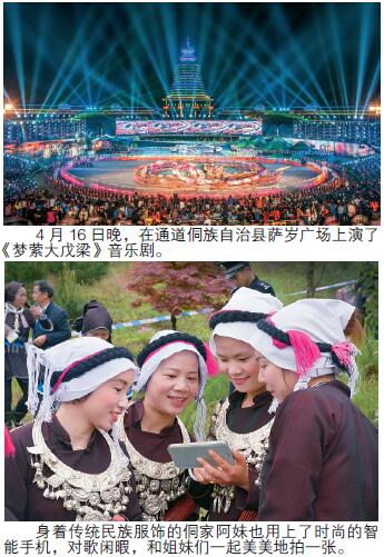 4月16日晚,一场由《蝉之歌》《回梦》《惊梦》《圆梦》《哆吔》五个篇章组成的《梦萦大戊梁》大型侗族音乐剧在通道县萨岁广场上演,再现了肖女与闷龙凄美动人的爱情传说。