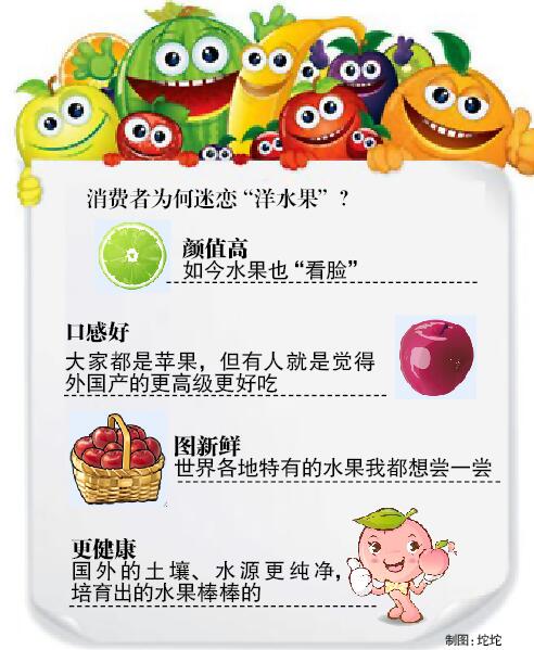 目前,我国各地尤其是海南、广东、广西、福建等地引进了大量国外优秀水果品种,所以,国内市场大多数号称进口的“洋水果”其实都是国产的,属于“洋二代”。像美国蛇果,大部分来自甘肃;美国红提自引进国内后,在山东、湖南、湖北都有大面积种植。这些水果经过一套流水线再加工,如分级、清洗、打蜡等,色泽光亮,形状饱满,完全能以假乱真,但成本要比进口水果低很多。