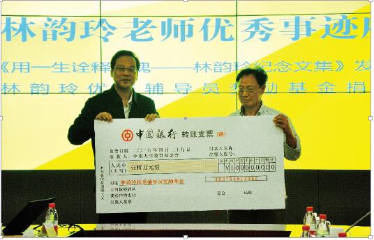 从《用一生诠释师魂——林韵玲纪念文集》的字里行间,从记忆中难忘的点点滴滴,陈寿如和两个儿子感受到了大家对于林韵玲的敬重和怀念,感受到了平凡岗位上也能作出不凡贡献的可贵和难得。陈寿如和家人一商量,决定捐资100万元,设立中南大学“辅导员基金”,“用来奖励那些和韵玲一样心系学生的优秀辅导员”。