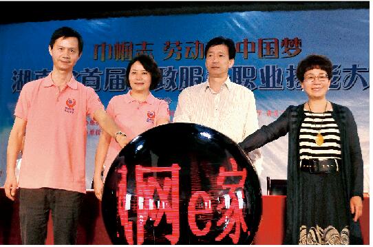 一场有省领导出席、由多个省直部门举办的省级赛事,湖南省妇联主席杜亚玲与省妇联副主席鲁华为何却穿着一身红色的文化衫坐上了主席台?原来,这是5月5日湖南省首届家政服务职业技能大赛开幕式暨“凤网e家”家庭服务平台启动仪式现场。当天,来自省直、各市州的16支参赛队伍100多名全省家政高手齐聚长沙,摩拳擦掌,在家政服务、育婴和养老护理3个项目展开角逐。开幕式后,湖南省人民政府副省长蔡振红、省政协副秘书长李微、省妇联主席杜亚玲与今日女报社社长王伏虎一起,为“凤网e家”家庭服务大数据平台启幕。
