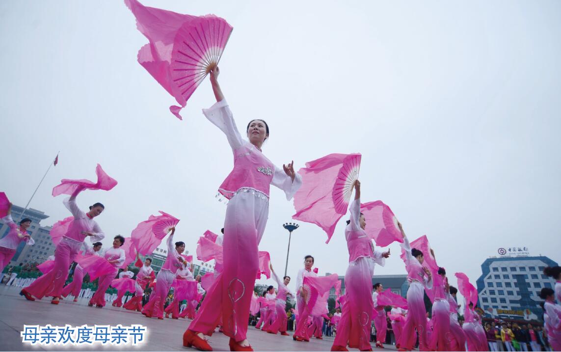 5月8日,郴州市和美健身协会成立12周年“为劳动者讴歌”主题大型千人健身活动在五岭广场举行,近两千名中老龄女性舞蹈爱好者组成5个方阵,分别展示了腰鼓、扇子舞、健身球、柔力球、筷子舞等团体操节目。这些母亲以一种健身运动的方式欢度母亲节。(特约记者 李科 摄)