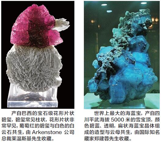 除此之外,还有世界顶级碧玺系列;产自澳大利亚的世界上最大的欧泊;产自云南的世界上最大的花状方解石单晶体之一,因其造型酷似湖南的省花——芙蓉,故被湖南人民称为“芙蓉花”;产自四川的世界上中国最大的海蓝宝、孔雀石等各类美丽的宝石……