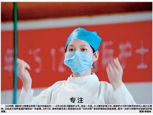 104年前,国际护士理事会将南丁格尔的诞生日——5月12日定为国际护士节。在这一天里,大力宣传护理工作,鼓励护士们学习救死扶伤的人道主义精神,已经成为世界各国护理界的一件盛事。5月11日,郴州市嘉禾县人民医院236名“白衣天使”参加护理岗位技能竞赛,图为一位护士神情专注地参加护理竞赛。
