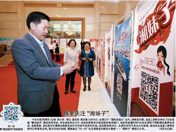 今日女报/凤网讯(记者 吴小兵 李立 通讯员 黄兰香)5月15日,在第23个“国际家庭日”当天,湖南省妇联、省直工委联合举办了全省首届“廉洁家风”建设系列活动,来自省政府办公厅、省发改委等近40家省政府组成部门、省政府直属机构140余位领导干部配偶应邀参加活动,省委常委、省纪委书记傅奎出席座谈会并与活动代表亲切交流。省妇联党组书记、主席杜亚玲代表主办方致辞。座谈会由省直工委常务副书记李爱武主持。图为活动开始前,傅奎通过“扫一扫”关注湖南省妇联官方微信——“湘妹子”微信公众号。 (详见A03版)