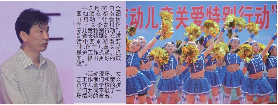 这是5月30日湖南省妇联庆“六·一”暨“让爱留守·百县千村万户农村留守流动儿童关爱特别行动”现场。省妇联副主席卢妹香、省妇联相关部室干部,湘西州各级党委政府及相关部门,永顺县荣众留守儿童学校全体师生、家长代表及新闻媒体记者近500人参加了这场充盈着温暖和关爱的活动。在全场师生的欢呼声中,杜亚玲宣布湖南省“让爱留守·关爱农村留守流动儿童特别行动”正式启动。