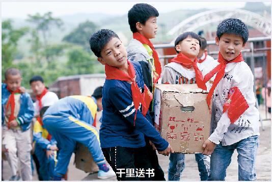 “六一”驾到,很多孩子都会收到心仪的礼物,而永州市道县柑子园镇五福村小学的“六一”礼物是2000册图书。这一礼物是长沙市志愿者和他们的小孩从千里之外送来的。图为该校学生将捐赠的图书搬到图书室。(摄影/何红福 )