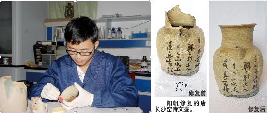除了青铜器,阳帆还是修复瓷器的好手。目前,长沙市博物馆所藏长沙窑瓷器4800余件,为全国馆藏长沙窑瓷器最多的机构。长沙窑首创釉下彩绘工艺,为中国第一座“彩瓷之窑”,为陶瓷装饰开辟了一条新的途径,突破了青瓷单一的局面。值得一提的是,长沙窑还是与越窑青瓷、邢定窑白瓷并称的中国瓷外销“三驾马车”之一。作为中国古代陶瓷史极其灿烂的一颗明珠和大唐文化艺术宝库的长沙窑,目前已成长沙最具特色的文化品牌之一。目前,长沙市博物馆已展出的部分长沙窑,都是经阳帆之手修复的。