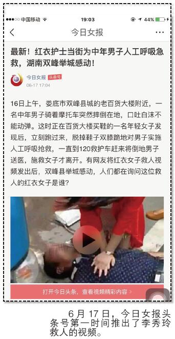 6月17日, 今日女报头条号上率先推出了护士李秀玲在街头急救路人的感人视频,并进行了新闻报道。