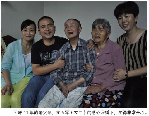 11年来,万军在做好本职工作的同时,精心照顾瘫痪在床的父亲,无怨无悔,忠孝两全;他的孝行,也感染了身边的每—个人。
