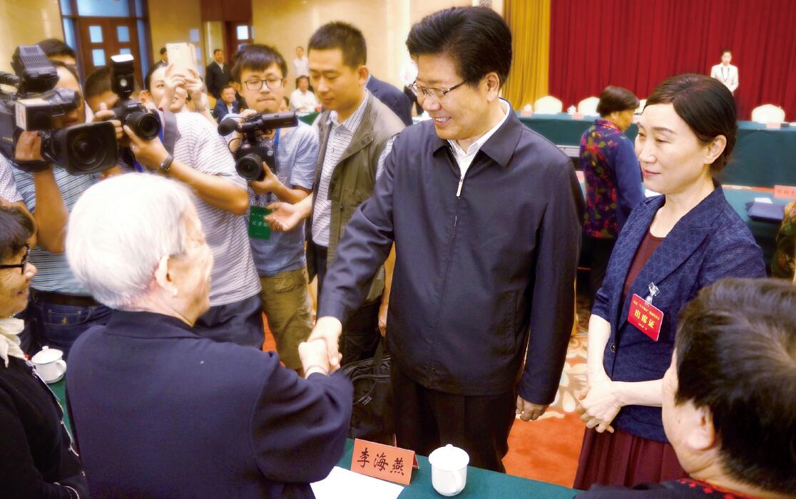 纪念“八千湘女”进疆66周年座谈会开始前,中共中央政治局委员、自治区党委书记、新疆生产建设兵团党委第一书记、第一政委张春贤(中),湖南省政协主席李微微(右)与参会湘女及湘女亲属代表亲切交谈、一一握手。