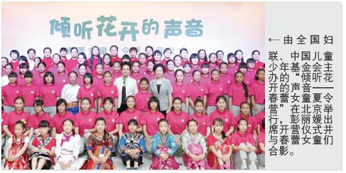 今日女报/凤网讯(通讯员 刘玉梅)7月25至30日,由全国妇联、中国儿童少年基金会主办的“倾听花开的声音——春蕾女童夏令营”在北京举行。春蕾计划促进女童教育特使彭丽媛出席开营仪式并为夏令营授营旗。“彭妈妈”勉励春蕾女童迎难而进,努力学习,早日成才。来自西藏、新疆、内蒙古、甘肃等省区多个民族共100名春蕾女童参加本次夏令营,湖南省张春燕、陈梓仪、李想、兰薇、林美等5名春蕾女童参加,其中陈梓仪作为全国代表在开营仪式上发言。
