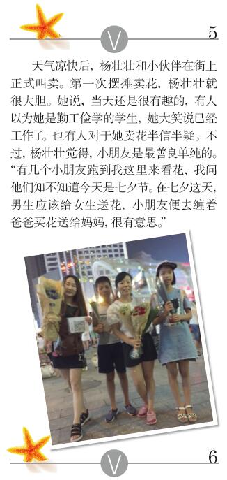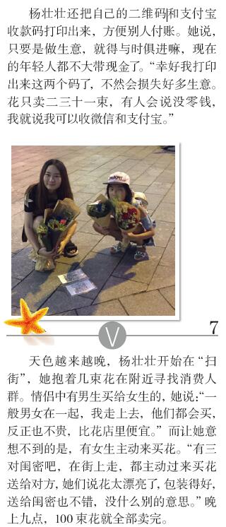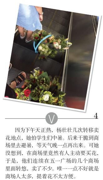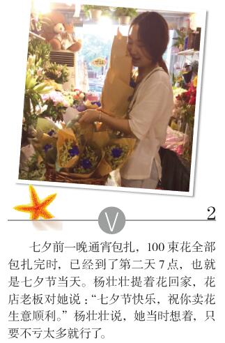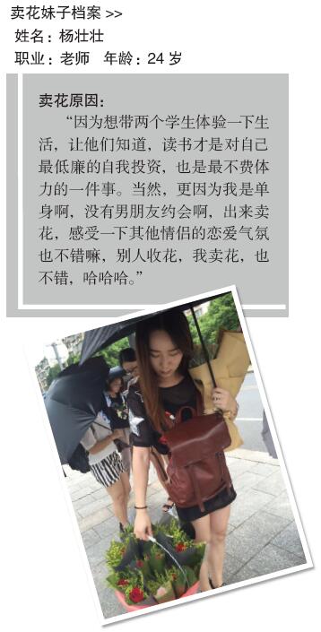 而意外收获就是,杨壮壮通过卖花这件小事,看出了很多男生性格。“我自己到目前没谈过恋爱,我也没收过花,但是我看到每个收花的女生都很开心,不管男生是爽快地买,还是抠抠缩缩地买。有些男生应该在热恋中吧,很大方,买几束,有些男生掏钱就很慢,不太情愿,哈,我觉得买花的过程可以检验男人是否真的爱你,尤其是当男人说‘买花干嘛,不实用,又不能吃又不用穿’,那他一定不浪漫。”