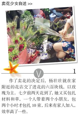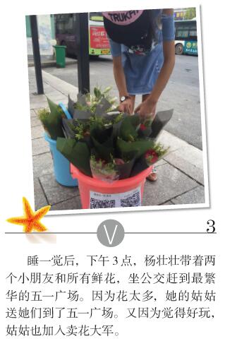 从下午3点出发,一个小时到五一广场,到晚上9点,100束花全部卖完,一共花了不到五小时,前两个小时还因为天太热,没有认真卖。