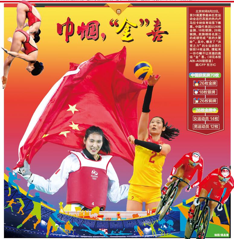 1届夏季奥林匹克运动会在巴西里约热内卢马拉卡纳体育场落下帷幕。中国代表团以26枚金牌、18枚银牌、26枚铜牌,奖牌榜排名第二的成绩完成“里约大冒险”。其中,爆发了“洪荒之力”的女运动员们斩获14枚金牌,撑起来一份巾帼不让须眉的奥运“金”喜。(详见本报A08-A09版报道)