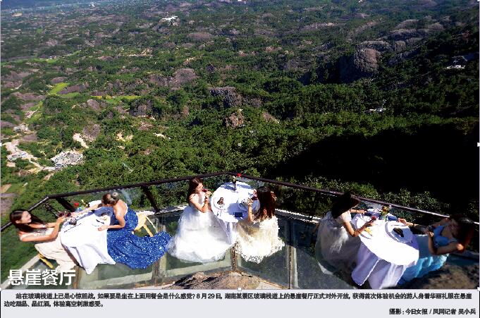 站在玻璃栈道上已是心惊胆战,如果要是坐在上面用餐会是什么感觉?8月29日,湖南某景区玻璃栈道上的悬崖餐厅正式对外开放,获得首次体验机会的游人身着华丽礼服在悬崖边吃甜品、品红酒,体验高空刺激感受。