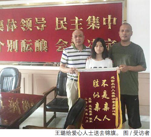 终于有书读的王璐8月15日到学校报到,8月14日则专程前往株洲,为这一群好心的叔叔阿姨送上锦旗,感谢他们让自己重拾学业。彭书红告诉今日女报/凤网记者:“当时,我们好好聊了一次。我宽慰她好好学习,不要担心钱的事情,中专两年学习毕业后,还将帮她安排一个合适的工作岗位。”同时,彭书红表示,对于王璐的奶奶和弟弟,他们也会想办法进行一些帮扶。
