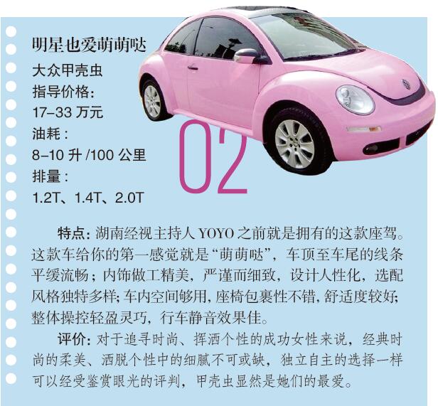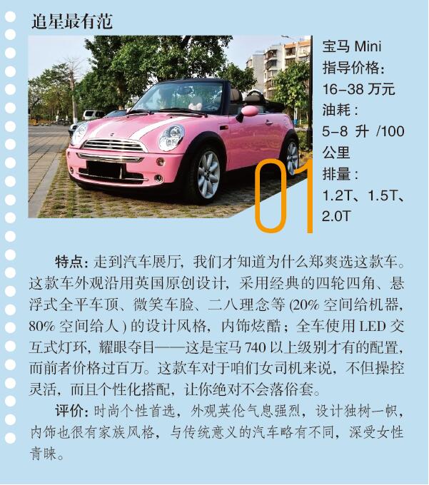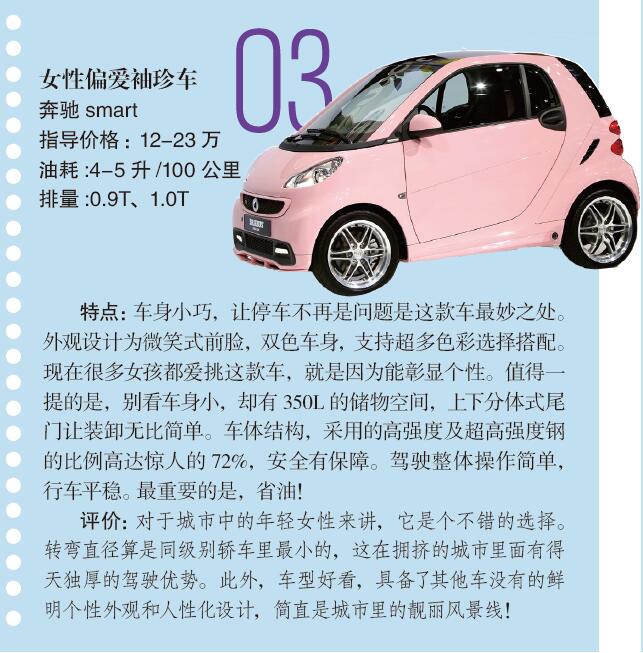 女生选车似乎从不在乎你用什么发动机,也不会管独立悬挂是什么东西,自动启停那又如何?她们更在意的是颜色是否暖心?化妆镜方不方便?够不够可爱时尚?为让湖南的女孩们像郑爽一样开得漂亮,今日女报/凤网记者跑遍了长沙城的多家4S店,从专家那里挖到最适合湘妹子开的粉红小车,让姑娘们轻松当回“粉红控”。