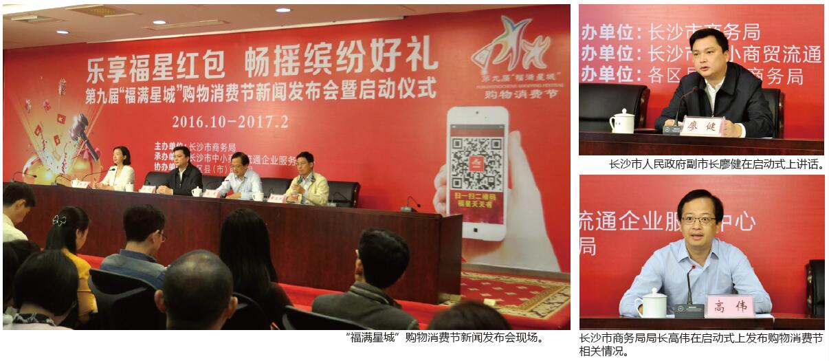 10月18日,由长沙市商务局主办,长沙市中小商贸流通企业服务中心承办的第九届“福满星城”购物消费节在市政府新闻发布厅举行新闻发布会。市人民政府副市长廖健讲话并宣布购物节正式启动,市商务局局长高伟进行了购物节活动新闻发布,副局长黄立斌出席并接受媒体采访。发布会由市委外宣办(市政府新闻办)主任陈智主持。