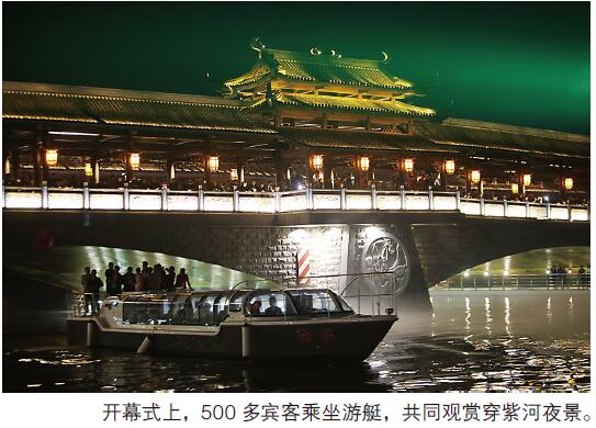 在开幕式现场演绎的“穿紫渔歌”、“依水筑城”、“河街旧事”、“浪漫之旅”四大篇章,将在场观众带入一个光影辉映、人水和谐的美好境界。在乘“水上巴士”沿穿紫河游览中,沿线11公里长的河道两岸展现了常德老河街原景、折子戏、常德丝弦、刘海砍樵音乐剧等实景演出。配上梦幻的灯光特效,常德本地民俗文化溶于水中,打造了一场古典与现代结合的唯美大赏。