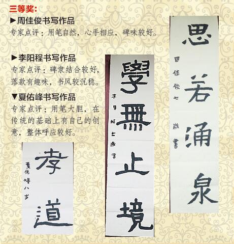 “用笔大胆、气韵流畅、结体舒展、在传统的基础上有自己的创意……”看到这么多小小年纪就写出这么多好字的作品,专业评委们连连发出赞叹声。