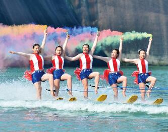 11月6日,郴州市苏仙区飞天山“亚洲级”水上特技汇报表演在飞天山景区翠江河畔举行。由“亚洲滑水皇后”黄美丽(中)带领的专业运动员队伍表演了水上金字塔、特技空翻、水上芭蕾、特技跳台、特技摩托艇、水上飞人等项目,赢得市民和游客的阵阵喝彩。摄影/贺茂峰