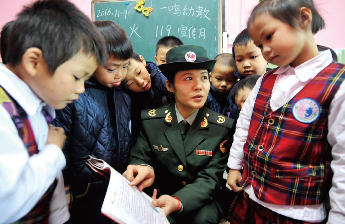 11月9日,全国“119消防日”,全省各地组织消防官兵、志愿者走进各学校开展消防安全知识进校园、进社区、进家庭等宣传活动。图为11月9日,郴州市嘉禾县一鸣幼儿园,消防志愿者向小朋友讲解消防安全知识。