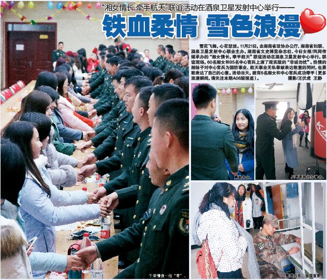 雪花飞舞,心花怒放。11月21日,由湖南省政协办公厅、湖南省妇联、酒泉卫星发射中心联合主办,湖南省文史博览杂志社、今日女报/凤网传媒承办的“湘女情长,牵手航天”联谊活动在酒泉卫星发射中心举行。联谊现场,60名湘女和95名中心官兵上演了现实版的“非诚勿扰”。热情的湘妹子对中心官兵为国防事业、航天事业无私奉献表达敬意的同时,也勇敢表达了自己的心意。活动当天,就有6名湘女和中心官兵成功牵手(更多浪漫瞬间,请关注本期A06版报道)。