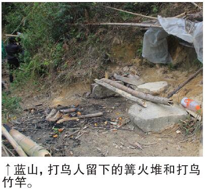 11月15日,在蓝山县林业局相关负责人的陪同下,记者同样在南风坳山头看到了打鸟人遗弃的竹竿。