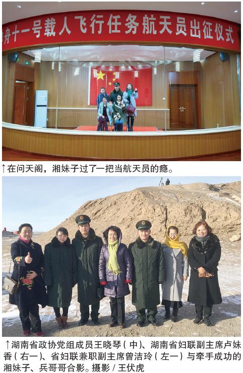 由湖南省政协办公厅、湖南省妇联、酒泉卫星发射中心联合主办,湖南文史博览杂志社、今日女报/凤网传媒承办的“湘女情长,牵手航天”联谊活动已进入尾声。这天,湘妹子们在我国第一颗人造地球卫星“东方红一号”的发射场地——东方红卫星发射场,航天员的工作生活区——问天阁,以及载人航天发射场进行了参观。