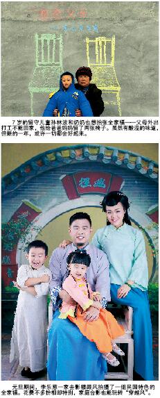 除了小家庭的奇妙创意,一些影楼也看到了商机。比如,当邓超和孙俪拍摄了一张民清版全家福后,不少小家庭也跟上明星的步伐,让全家福刮起“穿越风”;90岁的长沙嗲嗲傲娇地认为儿女的技术不过关,转而把专业摄影师请回家,拍摄充满爱意的家庭合影;针对“有儿不能回”的家庭,有影楼甚至只需老人提供一张单人照,就可以帮忙将远在他乡的子女照片置入软件合成大团圆照片……