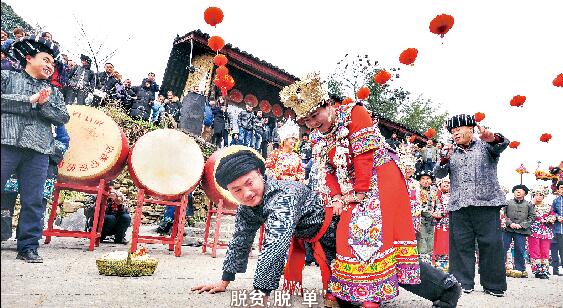 1月15日,农历腊月十八,正逢苗年。苗年是苗族同胞庆祝丰收的日子,湘西土家族苗族自治州花垣县十八洞村竹子寨昔日的特困户龙先兰也在这一天迎娶了漂亮的邻村阿妹吴满金。为此,村子里的男女老少都聚集过来。图为主持婚礼的司仪趁机“捉弄”新郎龙先兰。