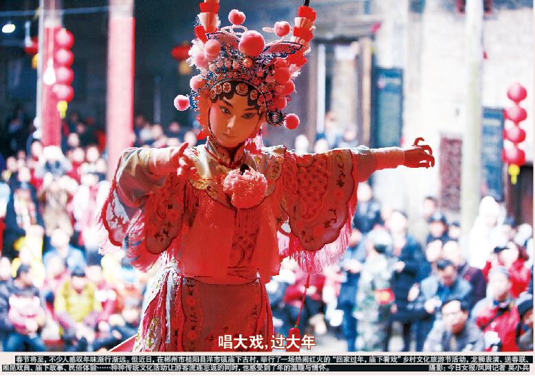 春节将至,不少人感叹年味渐行渐远。但近日,在郴州市桂阳县洋市镇庙下古村,举行了一场热闹红火的“回家过年,庙下看戏”乡村文化旅游节活动,龙狮表演、送春联、湘昆戏曲、庙下故事、民俗体验……种种传统文化活动让游客流连忘返的同时,也感受到了年的温暖与情怀。