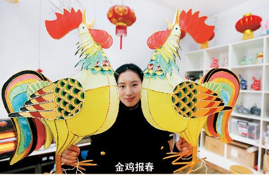 闻鸡起舞,生机勃勃。正月初七立春之后,已经开始新一年拼搏的各位,是如何度过自己的鸡年春节的?这不,不少游客就前往南通博物苑和非遗工坊,近距离接触蓝印花布、仿真绣、灯彩、棕编和剪纸等非遗工艺,感受非物质文化遗产的魅力。图为一名女孩展示南通灯彩传人何林祥制作的灯彩作品《金鸡报春》。
