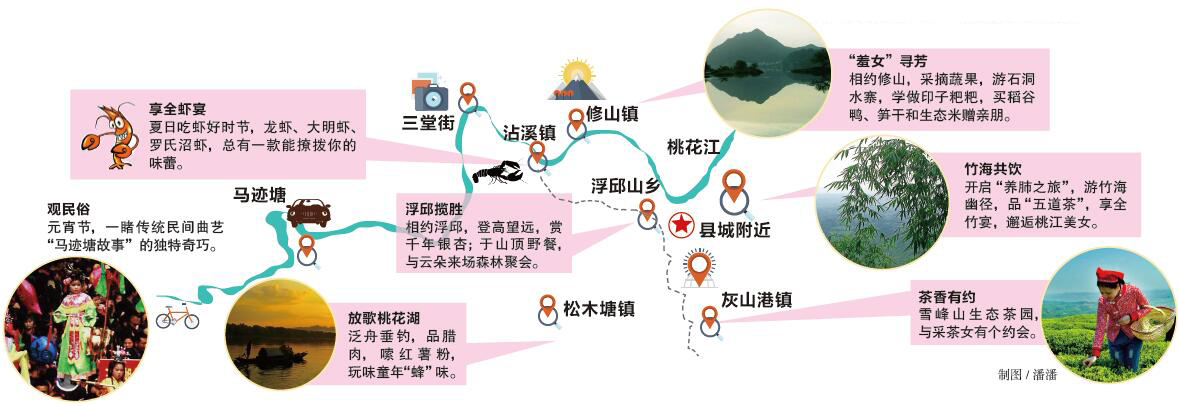如火如荼大搞建设,是桃江县于2016年11月进入国家全域旅游示范区创建单位的时代背景。在此进程中,桃江不断促进“旅游+美丽乡村”的融合,以打造“美丽乡村”为契机,大力发展民俗观光、生态观光、农家乐、休闲度假等特色旅游,不断丰富旅游内容,满足广大游客观光、休闲、健身、餐饮娱乐等消费需求,加快旅游产业的发展。