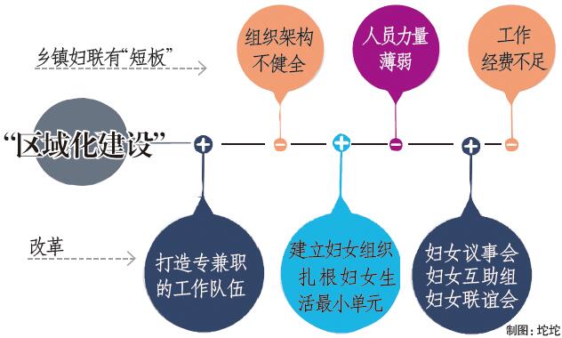目前,乡镇一级妇联组织还存在许多问题,突出表现在组织架构不健全,存在不少“空壳组织”;人员力量薄弱,很多乡镇妇联没有配备兼职副主席和妇联专干,长年不开展活动;同时,基层妇女组织还存在工作经费保证不足,乡镇妇联普遍没有专项工作经费等问题。加快推进全国乡镇妇女组织区域化建设就是为了补齐这些“短板”,将妇联的组织链条和工作触角向乡镇全区域延伸,形成乡镇辖区内各个单位、各个组织、各个领域的女性共同参与、开放互动、全面覆盖的妇联组织建设和妇女工作新格局。