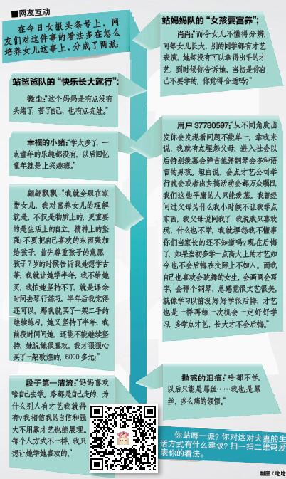 我女儿现在上小学三年级,我的心愿就是希望她快快乐乐健健康康地长大,而我妻子却一心一意想把她培养成一个大人物,尤其是大明星。女儿到现在为止,上过的培训班我十个手指数不过来,费用应该有二十多万。现在妻子还要给女儿买钢琴,那要几万元啊!我当然拒绝。
