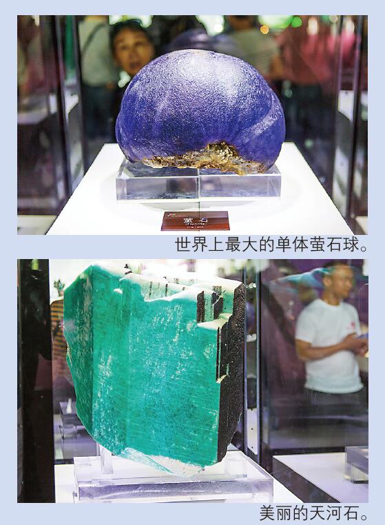 本届矿博会集中展示了来自全球各地的矿晶、化石、奇石、宝石等精品,不少宝贝世上“独此一份”,其中又以一块世界最大的红碧玺最吸引游客眼球,堪称全场焦点。这块高80厘米,宽30厘米,重100公斤的红碧玺,产地巴西,著名收藏家郑建蓉先生跟进协调了2年,方被同意在本届矿博会上展出,此碧玺也是48年来首次展出的世界最大的红碧玺,一部分国际顶级收藏家此次特地为它而来。除此之外,世界最大的一块海蓝宝晶体、世界最大单晶体萤石球、产自福建的“萤石之王”等宝贝为矿物宝石爱好者献上了一顿视觉大餐。