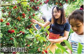 今日女报凤网讯(通讯员 潘雨 刘杰华)6月11日,游客在怀化靖州苗族侗族自治县后山溪杨梅基地采摘杨梅。靖州杨梅种植历史超过2000年,是全国杨梅主产区之一,被称为“中国杨梅之乡”,其特产“木洞杨梅”有“江南第一梅”的美誉,全县杨梅种植面积达8.6万亩,产量约6万吨,产值达10亿元。