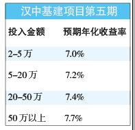 “凤网金服”俱乐部为会员推荐的政信理财产品——“汉中基建项目”第五期,预期年化收益率7.0%~7.7%,期限24个月。产品认购起点低,安全性高,按自然季度付息,到期还本并支付最后一次利息。该项目国企参投,发行方为AA级发债企业,实力强;属于省级重点项目,前景广阔,更有多级风控措施层层保障。