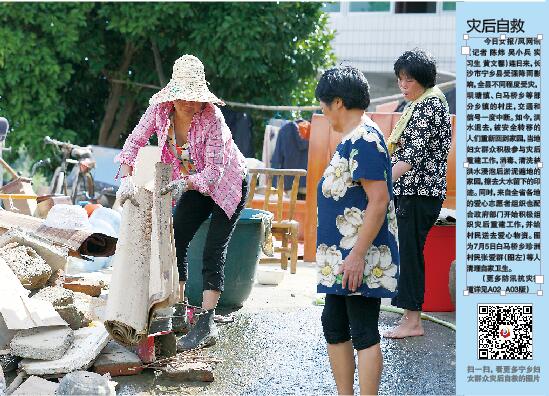 今日女报/凤网讯(记者 陈炜 吴小兵 实习生 黄文馨)连日来,长沙市宁乡县受强降雨影响,全县不同程度受灾,坝塘镇、白马桥乡等部分乡镇的村庄,交通和信号一度中断。如今,洪水退去,被安全转移的人们重新回到家园,当地妇女群众积极参与灾后重建工作,消毒、清洗被洪水浸泡后淤泥遍地的家园,擦去大水留下的印迹。同时,来自全省各地的爱心志愿者组织也配合政府部门开始积极组织灾后重建工作,并给村民送去爱心物资。图为7月5日白马桥乡珍洲村民张爱群(图左)等人清理自家卫生。